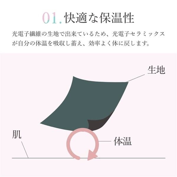 一般的に売られている靴下の生地は、布地と皮府との間の衣服内空間を温めるため、脱衣後、体温は下がりやすくなってしまいます。一方、光電子繊維は、光電子セラミックスが自分の体温を吸収し蓄え、効率よく身体に戻します。